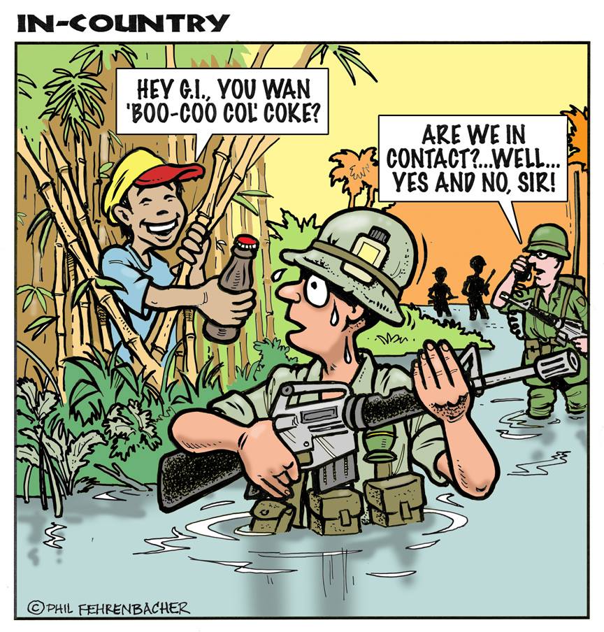 Phil enlisted in the Army in 1965 where you served for years in Vietnam. He became a graphic designer and has worked for the state of Oregon for 26 years. He retired in 2003 and started the Cartoon "In-Country". The cartoons reflect his experiences during his tour of duty in South Vietnam.